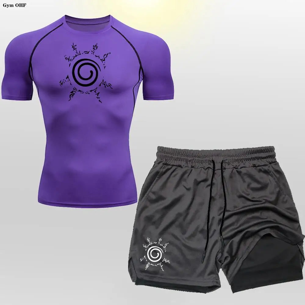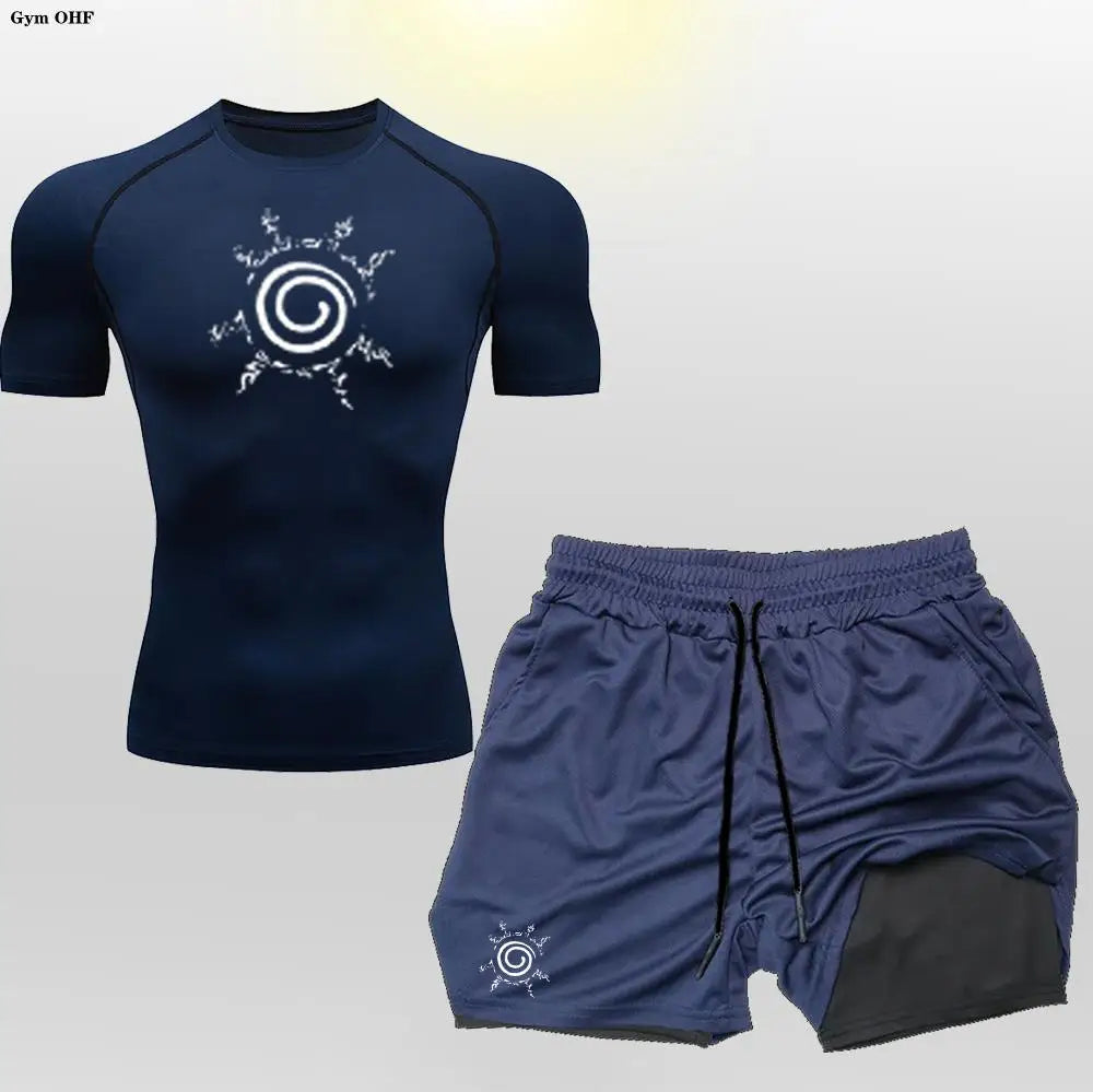 Anime Compression Shirt Men 2 in 1 Shorts Fitness Gym Workout MMA Rashguard Jiu Jitsu Running Joggers Training Clothes Sets